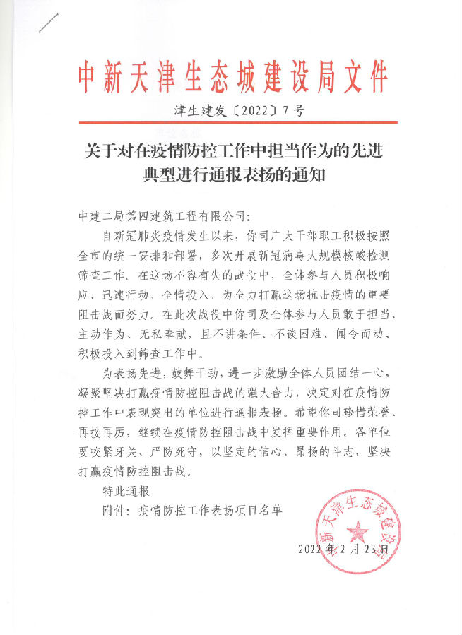 近日,公司收到來自中新天津生態城建設局的文件。文件對公司天津貽成學府項目在疫情防控工作中主動擔當作為的突出表現給予肯定。
